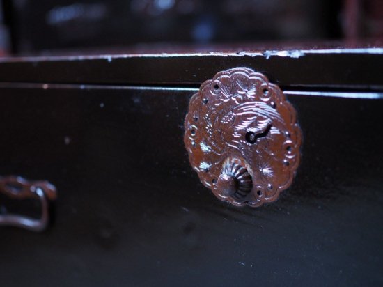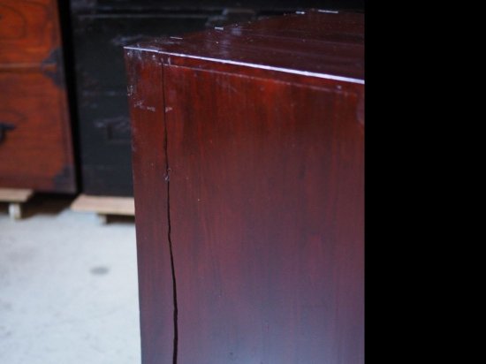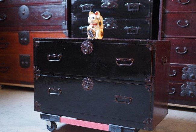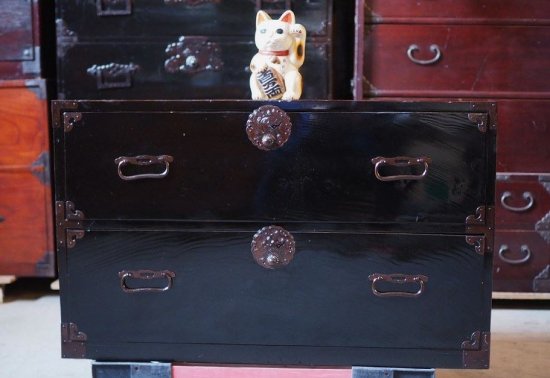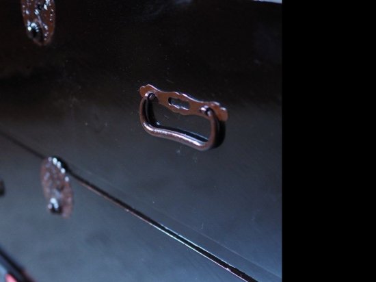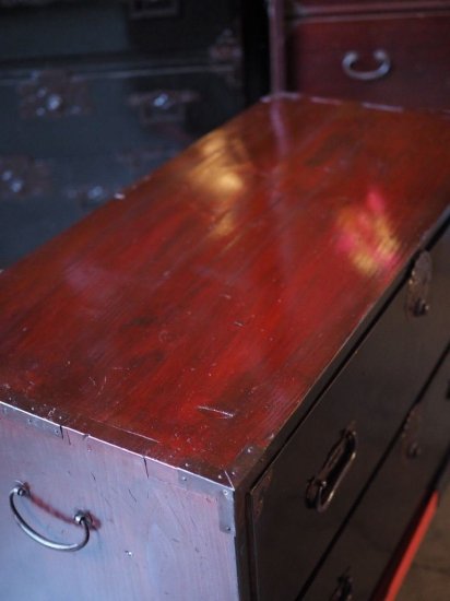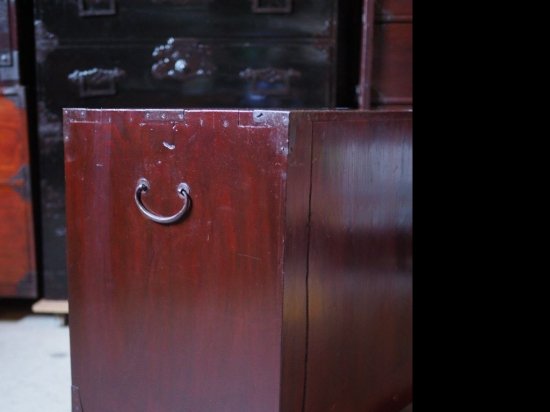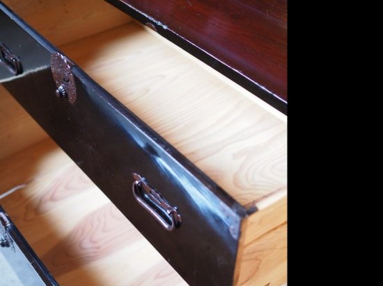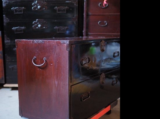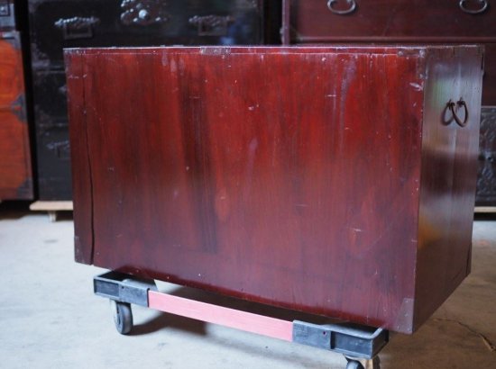 Antique Low Board, Yamagata Shonai Tansu, Taisho - early Showa period. Shonai-dansu is a traditional craft made in the Shonai region of Yamagata Prefecture, with a history dating back to the early Edo period. Made of hard woods such as zelkova and paulownia, they are characterized by their beautiful finish, which makes the most of the grain of the wood, and by their sturdy construction. There are various types of chests, including costume chests, tableware chests, and wedding chests. In particular, many costume chests are decorated with elaborate carvings and metal fittings, and are popular as high-end furniture. While inheriting traditional techniques, they have been improved to make them easier to use in modern life. In recent years, they have also become one of the most popular traditional crafts among the younger generation.