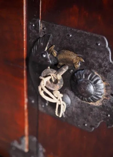A 100-year-old chest of drawers with beautiful grain of Japanese zelkova on the front. Can be used as a lowboard, chest of drawers, TV stand, exhibition stand, etc. There is no key.