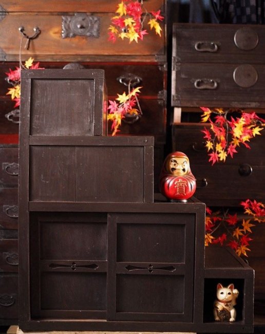 Antique stair chest of drawers originating from an old folk house in the Meiji period, dating back to the 1880s-90s. Exhibiting a weathered appearance, this piece is ideal for collection shelves and store fixtures. Note that the lower window panel is missing; kindly refer to the provided images for signs of deterioration over time.