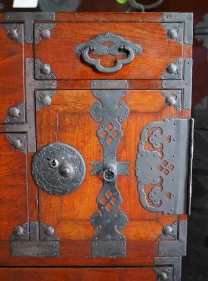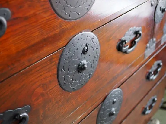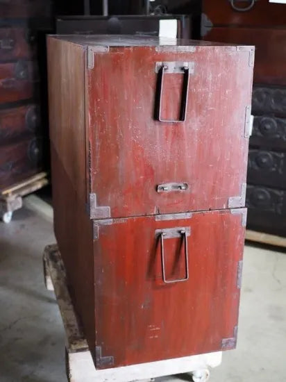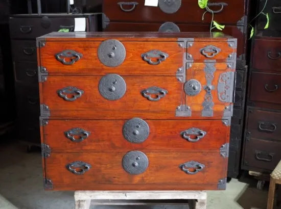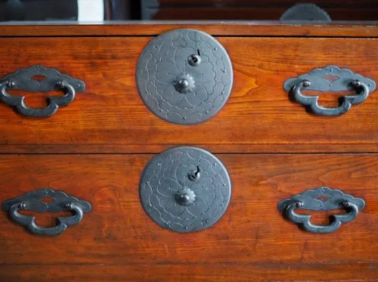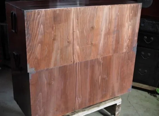 Bright in color, the front panel features beautiful chestnut grain. Perfect for storing antique kimonos, they can also be used side-by-side as a lowboard or in another room. There are no locks.