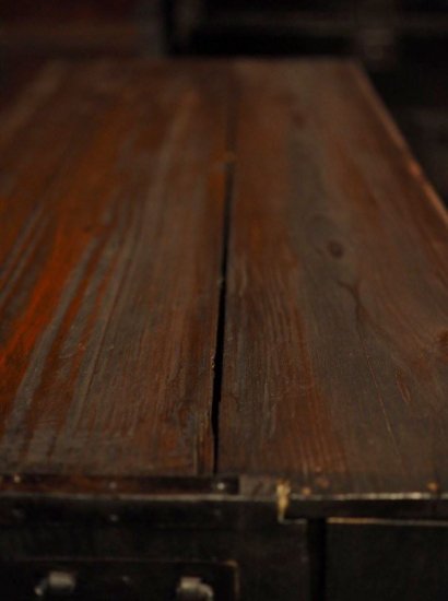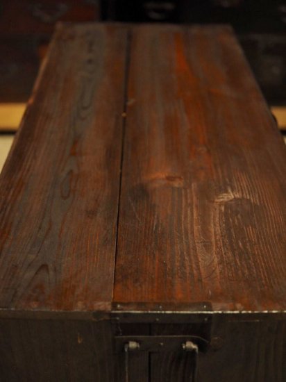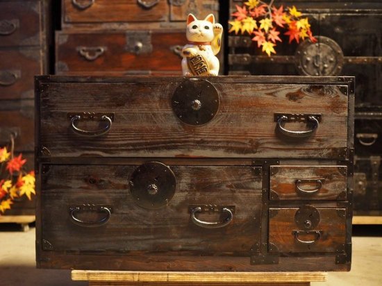 A century-old antique chest of drawers, a low board chest from the Meiji era, exuding timeless elegance and unparalleled craftsmanship. Despite bearing some scratches and cracks, its installation instantly transforms it into a modern Japanese antique interior piece. Versatile in function, it serves well as a TV stand or an antique kimono chest. Note that keys are not included.