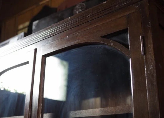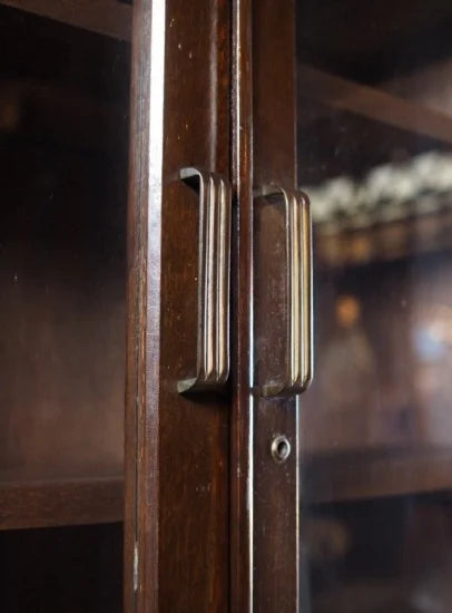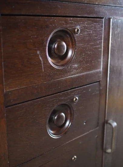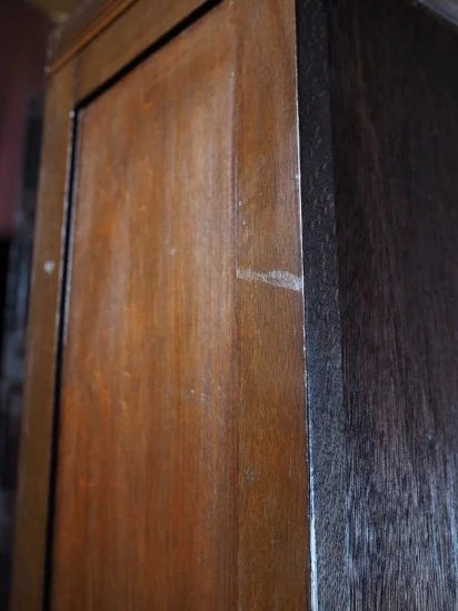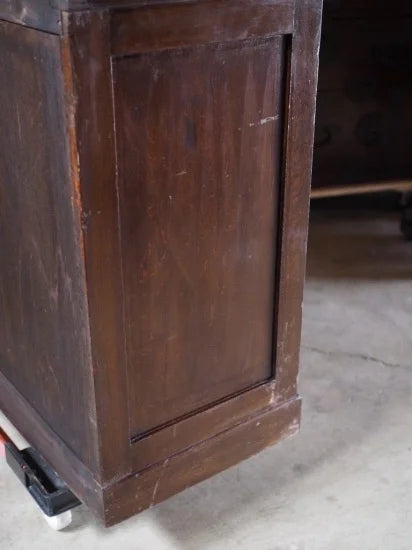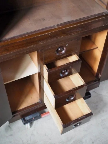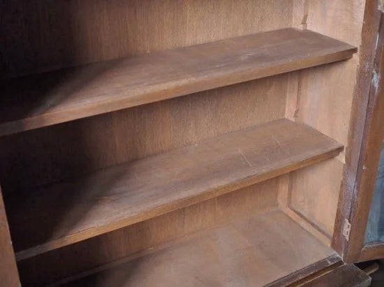 A retro piece with an elaborate design. Can be used as a cupboard, bookshelf or product display shelf. There are peeling areas on the veneer on the top. Please check the images and videos for signs of deterioration.